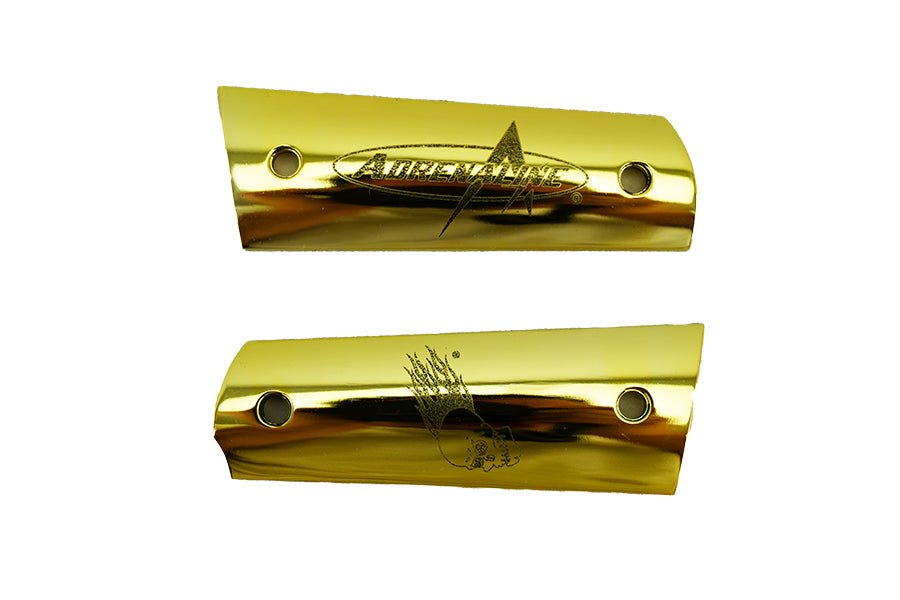 The Adrenaline Shocker Electroless Gold Plated Mechanical Grips are custom aluminum grips machined by Adrenaline. While standard 1911 grips have universal latch and safety cuts, these grips were custom designed for the Adrenaline Shocker and DLX Shocker CVO, AMP and ERA mechanical frames. Each set includes 4 extended length stainless steel screws to secure it to the frame.